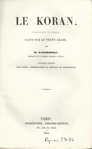 Le Koran / traduction nouvelle faite sur le texte arabe par M. Kasimirski ... ; nouvelle edition avec notes, commentaires et préface du traducteur.-- Paris : Charpentier, libraire-éditeur ..., 1844.