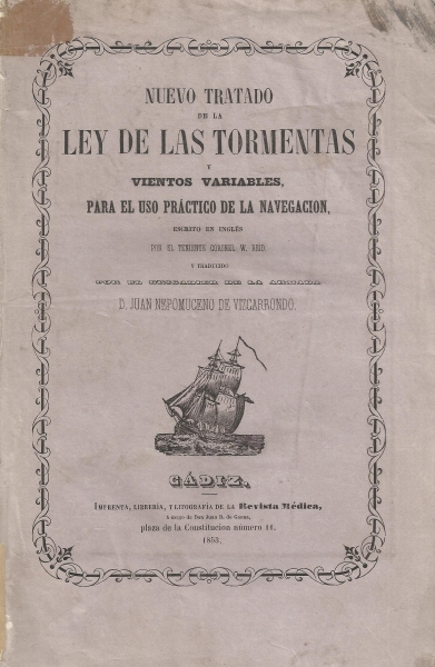 "Nuevo tratado de la ley de las tormentas y vientos variables para el uso práctico de la navegación", escrito en inglés por W. Reid y traducido por Juan Nepomuceno de Vizcarrondo (Cádiz, 1853)