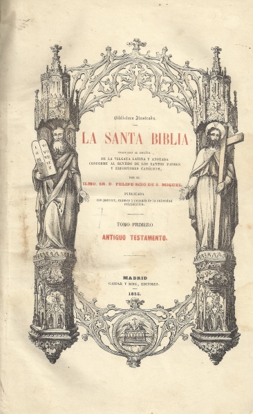 La Santa Biblia / traducida al español de la Vulgata latina y anotada conforme al sentido de los Santos Padres ... por Felipe Scio de S. Miguel.-- Tomo Primero Antiguo Testamento.-- Madrid : Gaspar y Roig, editores, 1852.