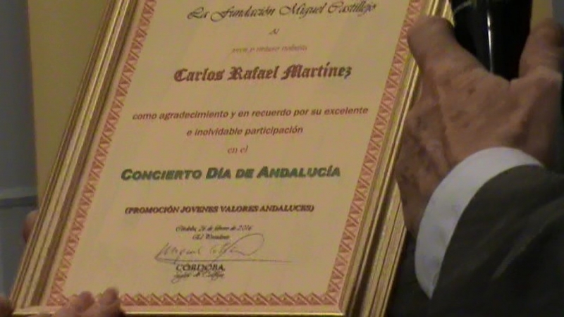 "Como viene siendo habitual desde hace años, pretendemos celebrar la festividad del Día de Andalucía ofreciendo un concierto de difusión cultural para nuestro habitual público, pero con el objetivo prioritario de promocionar y apoyar a jóvenes valores de nuestra tierra, para dar a conocer su valía y ayudarles en su difícil carrera artística y profesional. Entendemos que es una de las más positivas maneras de aprovechar esta actividad, para que, además de poder ensalzar la festividad de nuestra Comunidad Autónoma darles a conocer a un jovencísimo violinista de la provincia, Carlos Rafael Martínez, que a pesar de su juventud, presenta ya un gran conocimiento técnico del instrumento y una altísima calidad interpretativa, que van a poder apreciar Uds. en este concierto, con un programa intenso y de gran dificultad. Viene presentado y excelentemente acompañado por un consumado y reconocido pianista: el concertista José García Moreno, profesor del Conservatorio Profesional de Música de Lucena y Académico correspondiente de la Real Academia de Córdoba, persona muy conocida en los círculos musicales cordobeses y con amplia experiencia concertística, que se ha sumado de forma altruista en nuestro objetivo de apoyar al joven violinista."