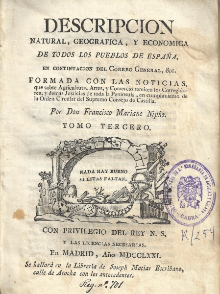 Descripcion natural, geografica y economica de todos los pueblos de España : en continuacion del Correo general... / por don Francisco Mariano Nipho ; tomo tercero.-- En Madrid : se hallara en la libreria de Joseph Matias Escribano...,1771.