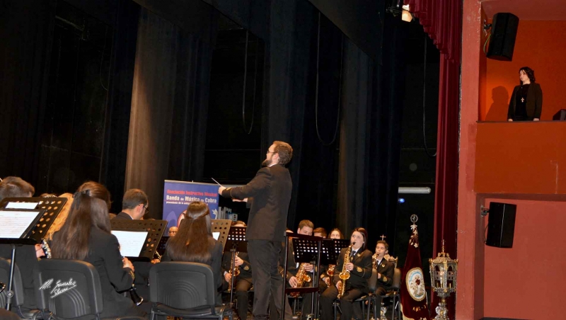 El escenario del teatro, ocupado totalmente por los miembros de la agrupación tenía unos símbolos significativos de la Semana Santa de Cabra, una estrella de la pareja que acompaña la Cruz de Guía de la Cofradía del Santo Entierro y dos de los faroles que rematan las cuatro esquinas del trono del Sepulcro de Plata de Cristo muerto, de dicha cofradía. El pie del podio del director lo adornaba un gran ramo de flores.