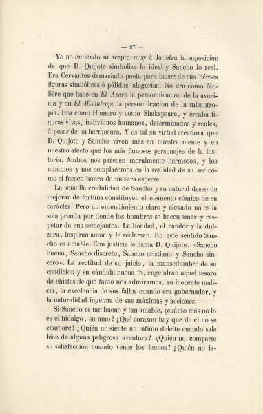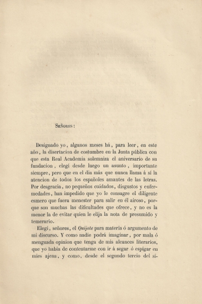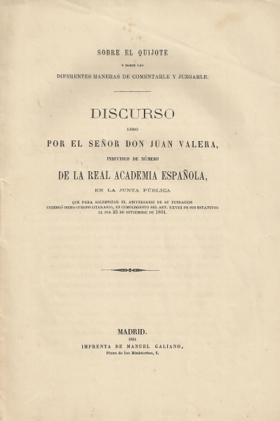 Sobre el Quijote y sobre las diferentes maneras de comentarle y juzgarle: discurso leido por el señor Don Juan Valera, individuo de número de la Real Academia Española en la junta pública para solemnizar el aniversario de su fundacion celebró dicho cuerpo literario, en cumplimiento del Art. XXVIII de sus estatutos el dia 25 de setiembre de 1864.-- Madrid : [s.n.], 1864 (Imprenta de Manuel Galiano)