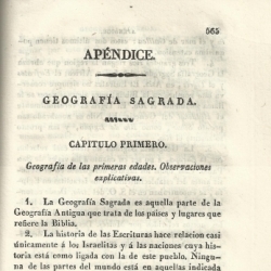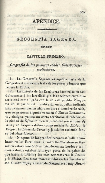 A pesar de no ocupar mucha paginación hay que destacar el apéndice dedicado a la geografía sagrada; es decir, a aquella parte de la geografía antigua que trata de los países y lugares que refiere la Biblia, cuya autoría corresponde a Antonio Sánchez de Bustamante. Está dividida en nueve capítulos: Geografía de las primeras edades, observaciones explicativas; Región comprendida entre Egipto y el país de Canaan, Viajes de los israelitas; Cananeos y naciones vecinas; Repartición del país de Canaan entre las tribus de Israel, Ciudades notables citadas en el Antiguo Testamento; Geografía física de la Tierra Santa; Palestina en tiempo de la historia del Nuevo Testamento, Samaria, Galilea y Perea; Países en que predicaron el evangelio los apóstoles; Viajes de San Pablo y de otros apóstoles. Se acompaña una tabla geográfica y cronológica de las obras del Nuevo Testamento, según Lardner.