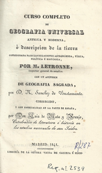 Curso completo de geografía universal Antigua y Moderna ó Descripción de la tierra considerada bajo las relaciones astronómica, física, política é histórica / por Letronne ; con un apéndice de geografía sagrada por M. Sánchez Bustamante ; corregido y con especialidad en la parte de España por Luís de Mata y Araujo.-- Madrid : Librería de la Señora Viuda de Calleja é Hijos, 1841 (Imprenta que fué de Fuentenebro á cargo de Alejandro Gómez)