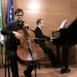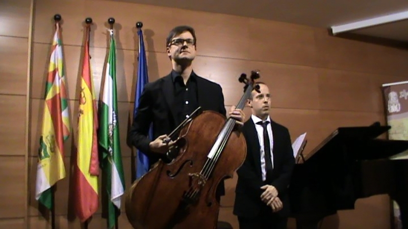 Tras la presentación del Concierto por el profesor de violín del Conservatorio de Cabra, Manuel Márquez, comenzó este con la "Sonata para clarinete y piano (transcripción para chelo y piano) Op. 120 nº 2 en MI BEMOL MAYOR" de Johannes Brahms (1833-1897), obra compuesta por el alemán rondando los sesenta y es una obra tranquila, dulce, amable en la que los dos artistas ya expresaron en sus tres movimientos su categoría interpretativa. Dejaron un buen "sabor de boca" de la música monumental de Brahms en esta su primera intervención.