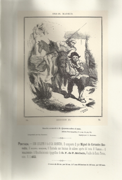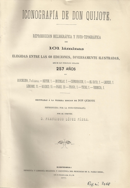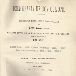 Iconografía de Don Quijote : reproducción heliográfica y foto-tipográfica de 101 láminas elegidas entre las 60 ediciones, diversamente ilustradas que se han publicado durante 257 años ... destinadas á la primera edición de Don Quijote reproducida por la foto-tipografía por el Coronel D. Francisco López Fábra.-- Barcelona : Imprenta y Librería religiosa y científica del heredero de D. Pablo Riera, 1879.