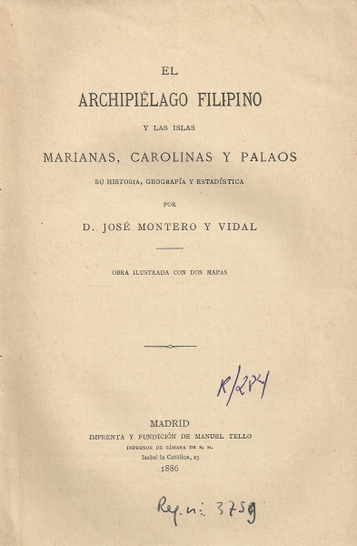 El Archipielago Filipino y las islas Marianas, Carolinas y Palaos: su historia, geografia y estadistica / por José Montero Vidal.-- Madrid : [s.n.], 1886 (Imprenta y Fundición de Manuel Tello)