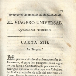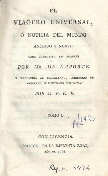 El viagero universal, ó noticia del Mundo antiguo y nuevo / obra compuesta en frances por Mr. de Laporte ; y traducida al castellano, corregido el original, e ilustrado con notas por D.P.E.P. ; tomo I.-- Madrid : en la Imprenta Real, 1795.