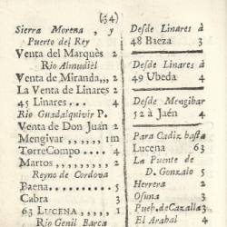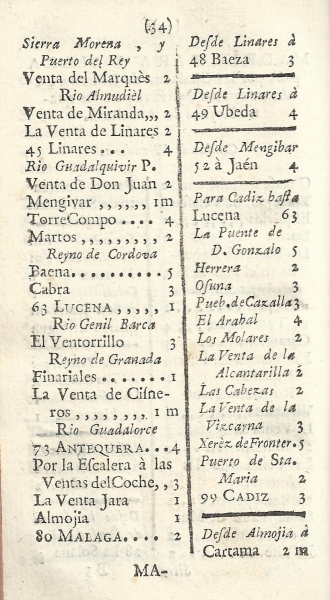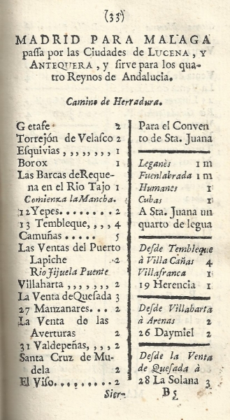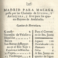El nombre de Cabra está en el apartado "Madrid para Málaga, pasa por las ciudades de Lucena y Antequera y sirve para los cuatro reinos de Andalucía. Camino de herradura". Los caminos de herradura son tan estrechos que solo pueden transitar por los mismos las caballerías, pero no carros. Sin embargo, el camino de ruedas (camino carretero) sirve para la circulación de carruajes.