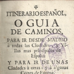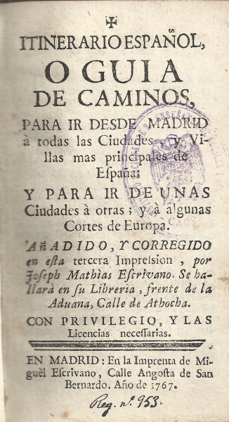 Itinerario español o Guia de caminos para ir desde Madrid à todas las ciudades y villas más principales de España : y para ir de unas ciudades à otras : y à algunas Cortes de Europa.-- Añadido y corregido en esta tercera impresion por Joseph Mathias Escrivano.-- En Madrid : en la Imprenta de Miguel Escribano ... (se hallarà en su Libreria ...), 1767.
