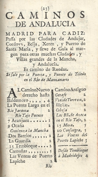 La primera columna muestra los caminos de ruedas y herradura saliendo de Madrid, vía recta, a todas las ciudades de España; y la segunda columna, que es más angosta, señala todos los caminos para otras ciudades y villas que se apartan de la vía recta. Cuando no finaliza un camino en la primera columna se pasa a la hoja siguiente de la primera columna, y en los caminos de la segunda columna a la segunda de la vuelta o de la plana siguiente, y para buscar las llamadas se nombra el lugar y leguas desde donde se separa un camino del otro. También, a veces, señalan los ríos con una R, las barcas con B y los puentes con P.