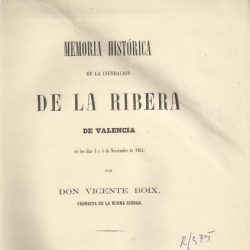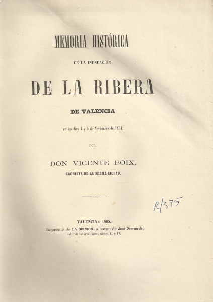 Memoria histórica de la inundacion de la Ribera de Valencia en los dias 4 y 5 de Noviembre de 1864 / por Vicente Boix.-- Valencia : [s.n.], 1865 (Imprenta de la Opinion, á cargo de José Domenech)