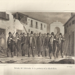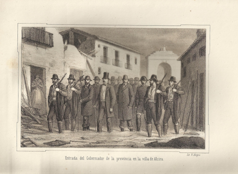 Retr. de Celestino Mas y Abad, gobernador de la provincia "Lit. V. Alegre...", las 7 h. restantes son perspectivas de las ciudades de Tous, de la venta de Boquilla, Carcagente y Alcira "Lit. V. Alegre"