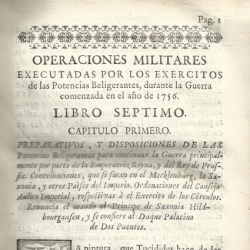 Cinco tomos forman el título "Historia de las operaciones militares ejecutadas por los ejércitos de las potencias beligerantes en Europa durante la guerra comenzada en el año 1756", traducida del idioma italiano al castellano por Nicolás de Labarre, capitán del Regimiento de Infantería de Zamora. Está dedicada al marqués de Minas e impresa en Barcelona, en la imprenta de la viuda Teresa Piferrer, durante los años 1759 a 1761. En el trabajo de catalogación solamente se encuentran los tomos III y IV, editados en 1760; ambos constituyen nuestro Libro de la Semana.