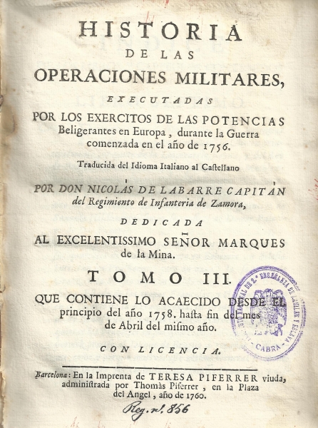 "Historia de las operaciones militares ejecutadas por los ejércitos de las potencias beligerantes en Europa durante la guerra comenzada en el año 1756", traducida por Nicolás de Labarre (Barcelona, 1759 a 1761)