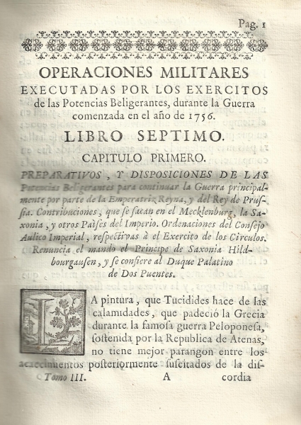 La investigación nos conduce a que el tomo I contiene desde el principio de la guerra hasta el mes de septiembre de 1757. El tomo II, desde el mes de septiembre hasta finales de diciembre de dicho año. Los tomos III y IV lo indicado anteriormente y el tomo V desde septiembre de 1758 hasta abril de 1759. Todos ellos tienen grabados de hojas desplegables. El argumento de la Historia de las operaciones militares nos sitúa, por tanto, en la Guerra de los Siete Años.