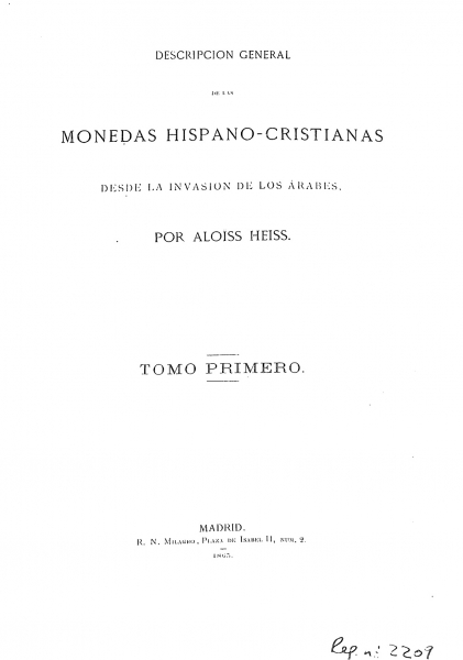 Descripción general de las monedas hispano-cristianas desde la invasión de los árabes / por Aloíss Heiss.-- Madrid : R.N. Milagro, 1865-1869 (Imp. de M. Galiano).
