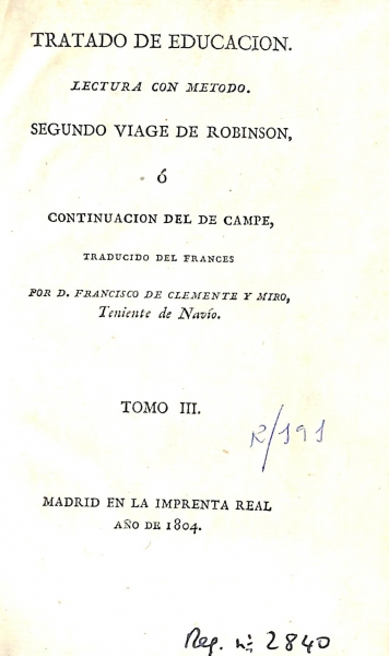 "Segundo viage de Robinson ó continuación del de Campe", traducido del francés por Francisco de Clemente y Miró (Madrid, 1804)