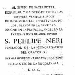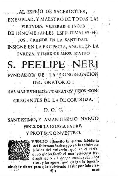 San Felipe Neri, llamado el apóstol de Roma (Florencia, 1515; Roma, 1595), fundador de la Congregación del Oratorio, que constituyó la proyección de su espiritualidad y su singular creación dentro de las distintas corrientes espirituales del Cinquecento italiano, es el modelo a seguir por los clérigos cordobeses de la comunidad, a quien piden protección y felicidad eterna. El primer texto lo pone de manifiesto: