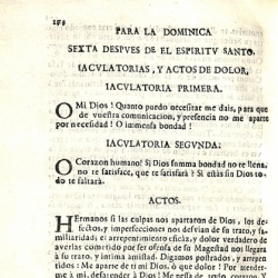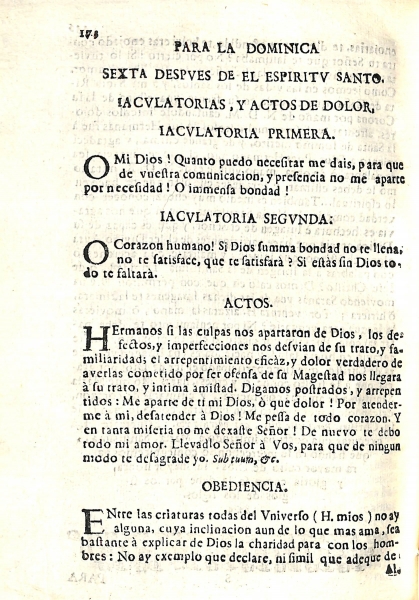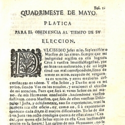 Los enunciados que encontramos en la estructura del volumen son los siguientes: Cuatrimestre de mayo, plática para la obediencia al tiempo de su elección; Plática de obediencia para la dominica segunda después de Resurrección, jaculatorias para la oración y actos de dolor para después de ella; Para la dominica tercera después de Resurrección, jaculatorias para la oración y actos de dolor para concluirla; Para la dominica cuarta después de Resurrección, jaculatorias y actos; Para el día de la Ascensión de N. D. M. Jesús, jaculatorias y actos; Para la dominica infraoctava de la Ascensión, jaculatorias y actos; Día de nuestro padre San Felipe Neri antes de la comunión general dirá el Obediencia; Día primero de Pascua de el Espíritu Santo a la comunión genera el Obediencia; Para la Pascua del Espíritu Santo, jaculatorias y actos; Para el día de el Corpus, jaculatorias y actos de veneración; Para la dominica infraoctava de el Corpus, jaculatorias para la oración y actos de dolor para el fin de ella; Para la dominica tercera después del Espíritu Santo, jaculatorias y actos de dolor: Para la dominica cuarta después de el Espíritu Santo, jaculatorias y actos de dolor; Para la dominica quinta después de el Espíritu Santo, jaculatorias y actos de dolor; Para la dominica sexta después de el Espíritu Santo, jaculatorias y actos de dolor; Para la dominica séptima después de el Espíritu Santo, jaculatorias y actos de dolor; Para la dominica octava después de el Espíritu Santo, jaculatorias y actos de dolor; Para la dominica nona después de el Espíritu Santo, jaculatorias y actos de dolor; Para el domingo diez después de el Espíritu Santo, jaculatorias y actos de dolor; Para el domingo once después de el Espíritu santo, jaculatorias y actos de dolor; Plática de obediencia para la comunión general y ejercicio de muerte día antes de la elección de Obediencia; Para la dominica doce después de el Espíritu Santo, jaculatorias y actos de dolor.