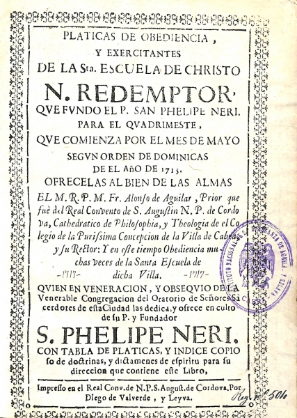 Platicas de obediencia, y exercitantes de la Santa Escuela de Christo ... que fundo el P. San Phelipe Neri para el quadrimeste [sic], que comienza por el mes de mayo ... de el año de 1715 / ofrecelas al bien de las almas ... Fr. Alonso de Aguilar.-- [Córdoba] : impresso en el Real Conv. de N.P.S. August. de Cordova, por Diego de Valverde y Leyva, [s.a.]