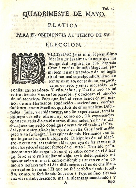 La portada del volumen que vamos a exponer está enmarcada en una cenefa xilográfica y tiene el título de "Pláticas de obediencia, y exercitantes de la Santa Escuela de Christo Nuestro Redentor, que fundó el Padre San Felipe Neri, para el quatrimestre, que comienza por el mes de mayo según Orden de Dominicas de el año 1715".