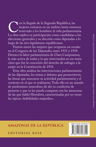 El libro Amazonas de la República. Las primeras diputadas 1931-1936, publicado por Editorial Base, refleja el papel de las mujeres diputadas en el periodo comprendido en los cinco años de la II República Española.
