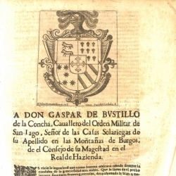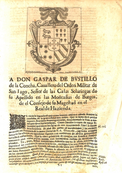 La dedicatoria a don Gaspar Bustillo de la Concha la firma fray Juan de Mora como su capellán, en un texto de sobrada admiración hacía el personaje en el que abundan frases elogiosas y rebuscadas: "Su nobleza con más ventura que el Sol, porque nunca se ha eclipsado como notorio es a todos, es la joya de oro de más subidos quilates que enriquece con orillos, real lustre, las casas solariegas antiquísimas de las montañas de Burgos, siendo el luminar más claro de hidalguías que corona de timbres luminosos con reflejos de candidos armiños la opacidad de sus valles"; si bien pide perdón por "lo atrevido del pincel en retocar con coloridos tan muertos el lienzo maravilloso de sus encomios tan vivos".
