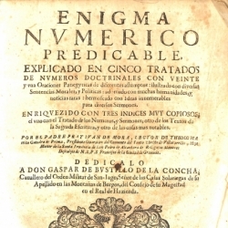 ENIGMA NUMÉRICO PREDICABLE explicado en cinco tratados de números doctrinales se acompaña con veintiuna oraciones panegíricas de diferentes asuntos, ilustrado con sentencias morales y políticas, y adornado "con muchas humanidades y noticias raras", según la portada. Además de "hermoseado con ideas innumerables para diversos sermones". Está enriquecido con tres índices muy copiosos que ocupan las últimas páginas. Uno con el Tratado de los números y sermones, otro con los Textos principales de la Sagrada Escritura y el tercero con las Cosas notables contenidas en el libro.