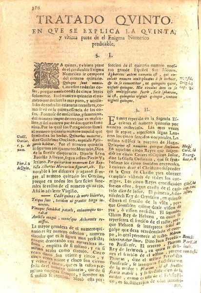 El tratado quinto explica la última parte del Enigma Numérico predicable. Se compone del número quinario: "Quinque sunt omnia". Cinco son todas las cosas, porque "omnia" consta de cinco letras solamente. Argumenta que "es el número quinario el numero que declara lo más puro y acrisolado de todas las criaturas terrestres, como se ve en la quinta esencia de las cosas. Formase de masculino y femenino, del número impar de tres que es masculino, y del número par de dos que es femenino; por lo cual los pitagóricos llaman al número quinario numero nupcial que simboliza las bodas".