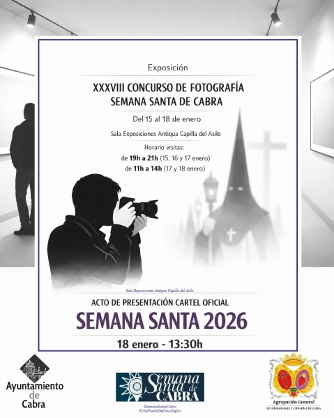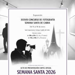 Asimismo, el domingo 18 de enero, a las 13:30 horas, en el mismo espacio expositivo, tendrá lugar el acto de presentación del Cartel Oficial de la Semana Santa de Cabra 2026, y la entrega de premios del XXXVIII Concurso de Fotografías, acto que pondrá broche final a esta exposición.