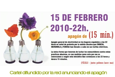 También en las redes sociales y en internet, se está haciendo circular un correo electrónico emplazando a un ‘apagón’ general contra Endesa el próximo domingo 15 de febrero. La convocatoria, que circula por correos electrónicos y páginas web de movilización social, critica la «subida abusiva que Endesa ha llevado a cabo en sus tarifas eléctricas». Según el e-mail de protesta, «es la única forma de luchar que tenemos los consumidores contra estas prácticas abusivas».