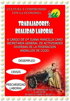 El próximo miércoles 23 de febrero, a las 20 horas, en la sede, sita en la calle Belén, número 14 comienza con una visión del panorama laboral de este siglo XXI, de la mano de JUANA MANCILLA, Secretaria General de Actividades Diversas de la Federación Andaluza de CCOO.