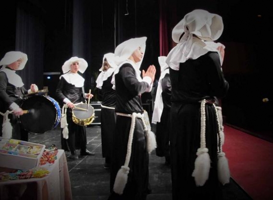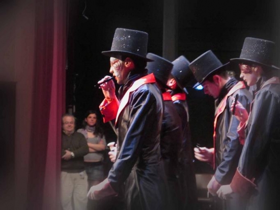 Si la primera noche tuvimos un aforo casi completo, en la segunda apenas vimos butacas vacías. A veces esos huecos son de groupies que esperan, jalean y abandonan definitivamente después de ver a su agrupación foránea. Cinco grupos para esta noche. De Loja (Granada) llegaba la comparsa “Peña los telarañas” que desde su ‘peña carnavalera’ nos cantaron "A la Vera Cruz de mayo, que no has salido en todo el año" algo que por aquella tierra cantan los más jóvenes con sus cruces al recorrer las calles del pueblo pidiendo un aguinaldo y aquí, claro, nos parece precioso pero nos quedamos sin ‘coger onda’. “Los que van por derechas” chirigota de Rute, chicos con posibles. Comenzaron con un guiño a la actualidad egabrense “si está el niño de Belén, aquí se puede fumar”. Pasodobles al jornalero y a la fiesta del toro. Primer cuplé para ponerle música a un chiste conocido y el segundo para pedir cambio de presidente. Se agradece la intención de poner pinceladas egabrenses en su popurrí. Pantalón verde, camisa y jersey rosas, náuticos de piel y profusión de banderas nacionales y logotipos conocidos en los complementos. Chirigota de Benamejí “Convento de apertura las Sor-prendentes”, disfraz al por mayor para un repertorio defendido a duras penas aunque gracioso, y sin olvidar que aludir a la religión puede tener su aquel, según se haga.