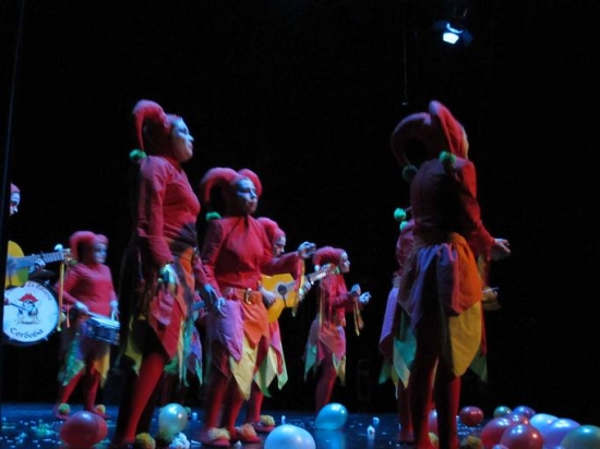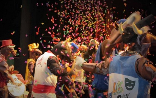 Cabra estuvo representada esta noche con una murga y una comparsa. La primera es la decana de nuestro concurso, desde su primera aparición en 1989 la agrupación de Loli Salido ha estado con nosotros una docena de veces, que si dice pronto. Murga ‘Sones y ritmos del Caribe con la Orquesta Tropicana’, primer pasodoble: piropo a Cabra, denuncia al maltrato en el segundo. El primer cuplé nos habla de la buena dotación de los caballeros de este grupo mixto. Alusión a Belén Esteban en el segundo. Los plenos de la corporación, la Calle Tinte, la ley antitabaco en Cabra, las lluvias en las Huertas Bajas, su San Antonio y un novio para nuestra Alcaldesa se hilvanan en el popurrí con brillo, porque eso es esta agrupación, brillo en el carnaval: chaqueta blanca con vivos en oro y mascota blanca para ellos, tocado alto, vestido entallado con volantes y media manga en tela con aplicaciones y bordados para ellas, favorecedora piel bronceada para todos. Dos alturas en el escenario y cuidada iluminación, como viene siendo habitual en todo el concurso y en especial entre las agrupaciones locales.