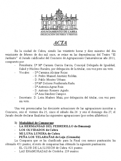 Si el año pasado despedíamos el concurso con la copla que nos regalaba la comparsa de Benamejí (El noticiero –primer premio-), este año abríamos el telón con la misma agrupación que, a punto de cumplir diez años con nosotros, se presentaba con el nombre de “La hermandad del febrerillo”. Sin sorpresas. Sus voces excelentes y su repertorio universal y bastante plano. No han llegado –y no han sido los únicos- a contarnos el porqué del nombre y el tipo (túnica marrón extralarga, poncho color camel de flecos, melena blanca y maquillaje en tonos grises). Esta sesión inicial se cerraría con el primer galardón 2010 en la modalidad de chirigotas: “Los incapaces, con la voluntad justa pa ir tirando” de Aguilar, cuarta participación en Cabra. Justificaron el premio obtenido el año pasado. Letras comprometidas e interesantes, pasodoble a las adicciones. Chándal y tripita, cinta al pelo y problemas para mantener la forma. Gustaron. Sólo tuvieron un problema: actuaron después de sus paisanos “Los que casando, casando, la vida se van buscando” que con ese nombre tan poco atractivo se estrenaban en el mundo del carnaval. Y lo han hecho por todo lo alto. Patio de butacas en pie –motu proprio- con esta chirigota. Chaqueta azul, cuadros y coderas amarillos a juego con gorra plana, vaquero ‘pegadito’ también en amarillo, bambas negras, foulards en distintos colores y gafas blancas, todo muy-muy cool. Ritmo y precisión en unas letras que hilaron fino y provocaron risas que no permitían seguir su repertorio a placer. Un consejo: si quieren organizar una boda, avisen a estos profesionales, igual no resulta demasiado correcto, pero desde luego tendrán la diversión asegurada. Atención a estos chicos que prometen, y mucho.