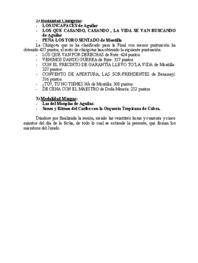 Comparsas: La hermandad del febrerillo (Benamejí), Los olvidados (Cabra), Mi luna lunera (Cabra), Peña los telarañas (Loja). Chirigotas: Los incapaces, con la voluntad justa pa ir tirando (Aguilar), Los que casando, casando, la vida se van buscando (Aguilar), Peña los toro sentado (Montilla). Murgas: Las del Monplás (Aguilar), Sones y ritmos del Caribe con la Orquesta Tropicana (Cabra).