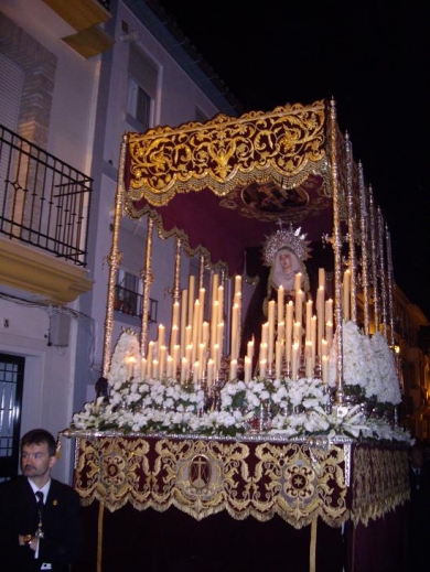 Algo más de un cuarto de hora, mantenían el paso del Cristo del Calvario y la Virgen de la Concepción sus costaleros, tras la salida de la Parroquia de los Remedios y hasta haber enfilado la calle Pepita Jiménez, mientras la Agrupación Musical Virgen de las Angustias de nuestra ciudad acompañaba el trabajo de los costaleros mandados por Eduardo Ramírez. El paso de misterio iba adornado con iris morado, y la imagen de Ntra. Sra. de la Concepción con saya blanca bordada y manto azul liso, simbolizando así los colores propios de la iconografía de la Inmaculada. En la trasera del paso pudimos ver el escudo de la Fundación Aguilar y Eslava, con la que mantiene estrechos vínculos esta cofradía, por su tradición inmaculista.