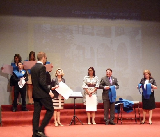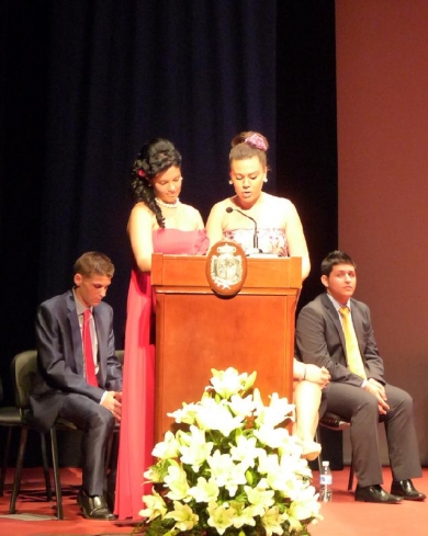 Luego vinieron las intervenciones de los representantes de los distintos cursos que se graduaban. María Hernández e Ismael Alguacil, lo hacían en nombre del Bachillerato de Ciencias y Tecnología; Marta Calvo y Miguel Angel Mesa, en rerpresentación del Bachillerato de Humanidades y Ciencias Sociales; Natividad Martínez y Miguel Ropero del Bachillerato de Artes y finalmente Isabel Cabello e Isabel Poyato en nombre de los alumnos y alumnas del Ciclo Formativo de Atención Sociosanitaria.