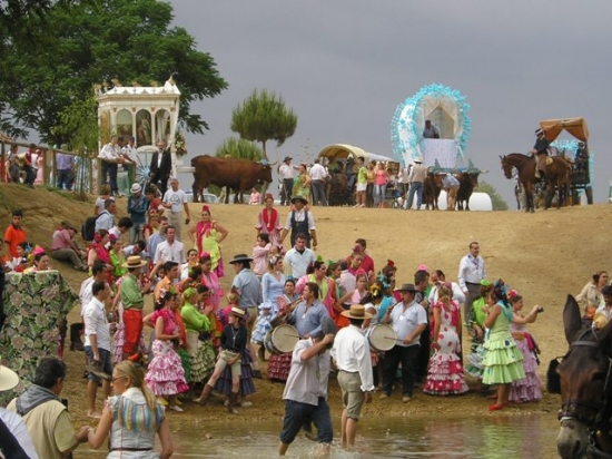 Por su parte, al Vado del Quema, otro de los puntos tradicionales del camino rociero en territorio hispalense –donde se suelen producir los ‘bautizos’ a los peregrinos que hacen por primera vez un camino—comienzan a llegar carretas. Concretamente las primeras en pasarlo son Málaga, Jaén, Málaga-La Caleta, Murcia, Almería, Lucena y Cabra.