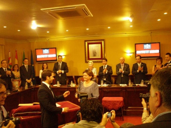 Los aplausos, al terminar el breve recuento de votos, se iniciaban desde la sala contigua al Salón de Plenos y luego todos los presentes se unían a este reconocimiento al nuevo Alcalde de la Ciudad, Fernando Priego Marín.