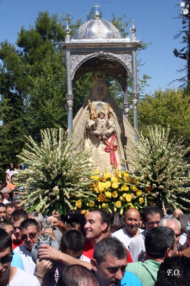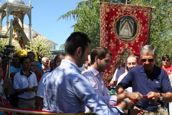 El ambiente de espera en el exterior del templo era de lo más tranquilo. Muchas de las personas desplazadas esperaban con ansias el inicio de la procesión de la Virgen de la Sierra que tuvo lugar una vez concluida la eucaristía. Una vez cogidas las andas plateadas que portaban a la Señora por sus fieles costaleros, el paso comenzó a avanzar entre las dos filas de bancos. Con lentitud y mucho cuidado, los costaleros llevaron los dos varales con sus manos hasta detenerse junto al dintel de piedra. Allí el reverendo bendijo las nuevas vidrieras que se han instalado en el lugar donde se custodian las denominadas «andas de viaje». Acto seguido, comenzaron a redoblar las campanas con ese toque tan característico anunciando el inicio de la procesión. El sol ya se reflejaba en la plata y la tez morena de la Virgen se iluminaba aún más cuando el templete asomaba entre la puerta. La Virgen, exquisitamente vestida y exornada salía de nuevo para comenzar un nuevo acto de fe en el que se vivieron momentos similares a otras ediciones de esta antigua romería, salvo en lo referente a otro de los actos previstos en el día de hoy como es la Bendición de la nueva y artística reja de forja que da acceso al santuario, aportando gran belleza al entorno. En dicho lugar, el hermano mayor de la Real Archicofradía, Agustín Mellado, junto al alcalde de Cabra, Fernando Priego, procedieron al corte de la cinta inaugural tras la apertura de la puerta principal de dos hojas que momentos más tarde traspasó la Virgen por primera vez, dando la vuelta en el exterior del recinto acotado.