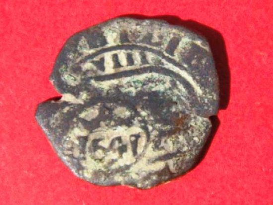 La primera pieza es una moneda de la Edad Moderna (del reinado de Felipe IV) que, a pesar de su tamaño, guarda una interesante historia, ya que se trata de una moneda anterior (de Felipe III) que es modificada (reacuñada) para darle otro valor.
