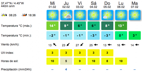 Para el jueves se espera una pequeña precipitación durante la mañana, entre las 7h y las 13h, con mayor intensidad entorno a las 10h, que podría dejar unos 4 l/m2, y es muy probable que lo haga en forma de nieve a cota de la ciudad de Cabra.