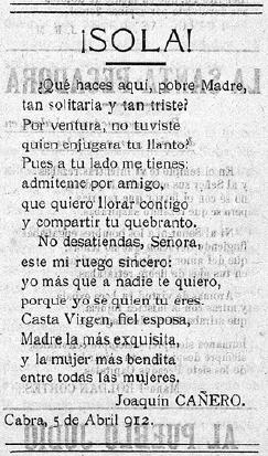 Dedicados a la Soledad, Joaquín Cañero publicaba en el número 4 de La Opinión, de 5 de abril de 1912, los versos que reproducimos: