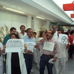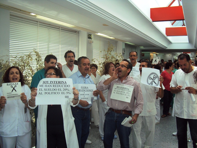 En torno a dos centenares de trabajadores del Hospital Infanta Margarita de Cabra han mostrado en esta mañana su enérgico rechazo a los recortes propuestos en el Sector de la Sanidad con gritos como "Griñán, Rajoy, de aquí no me voy" o "Griñán, Valderas, no me toques la cartera" frente a las puertas del Recinto Sanitario. Cabe destacar que en la manifestación sólo se han mostrado carteles alusivos a los recortes que se practicarán como un folio con un lazo negro que rezaba "Luto por la sanidad" o unas tijeras donde bajo ellas podían leerse las palabras "sanidad, salarios, calidad". Estos han sido los únicos carteles que han podido verse en la propuesta ya que las fuerzas sindicales con representación han decidido no portar sus emblemas como símbolo de unidad de los Sindicatos frente a la política de recortes que se pretende llevar a cabo.