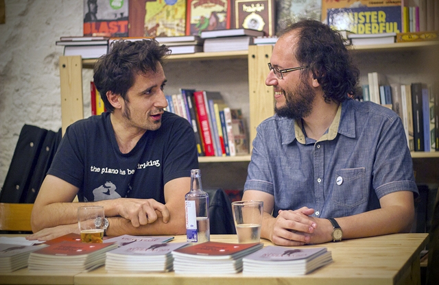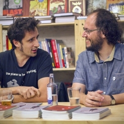 Por supuesto, estuvieron presentes Santi Campos (Amigos Imaginarios), Rául Bernal (Jean Paul), las ilustradoras de los dos volúmenes, Noemí Llantada y Cristina Ferreiro, además de Guillermo Galván, guitarrista y compositor de "Vetusta Morla", y Santiago Alcanda (Radio 3), veterano periodista especializado en música, cofundador con Juan Luis Cano y Guillermo Fesser de Gomaespuma. Ambos presentaron a los autores de los libros. Actuó de maestro de ceremonias nada menos que Javier Gallego, director y presentador de "Carne Cruda" de Radio 3, programa cancelado hace unas semanas por la nueva dirección de RNE, quien realizó una entrevista pública a Antonio de Egipto sobre la nueva editorial independiente "Bandaàparte". Los autores leyeron poemas, el uno del otro, terminando con la interpretación de algunas de sus canciones.