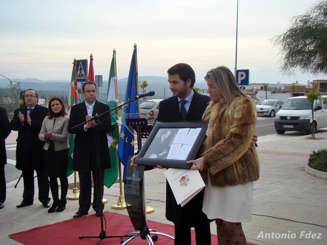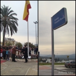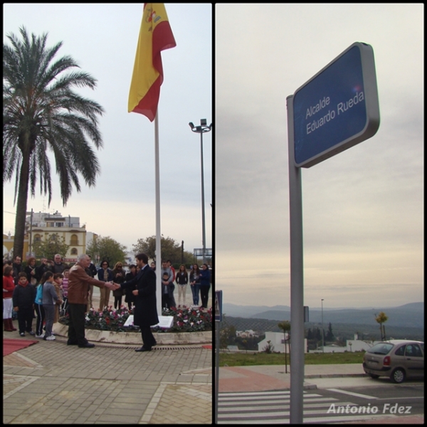 Por último, toda la comitiva se dirigía hacia una de las calles de la nueva urbanización PAU-R2, en la Cuesta de los Barreros donde se descubría la rotulación de una calle bajo el nombre "Alcalde Eduardo Rueda", que fuera Alcalde de esta localidad en la época de la transición además de Director de "las Escuelas", impulsor de CIATE, Hermano Mayor de la Hermandad del Cristo del Socorro (Silencio) y Presidente de la Agrupación de Cofradías de Cabra.