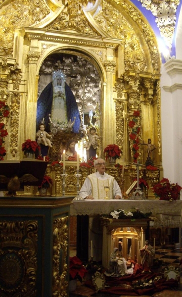 Tras visitar el Museo de la Pasión, cuyas reformas está ultimando la Fundación Aguilar y Eslava, d. José Burgos presidió la misa de acción de gracias en la parroquia de los Remedios, de la que ha sido párroco desde su creación y hasta su reciente jubilación. En la homilía señalaba los vínculos que mantiene con Cabra, su devoción hacia la Virgen en sus advocaciones de la Sierra y de la Soledad, así como la estrecha relación que mantiene con la Fundación e Instituto Aguilar y Eslava, desde muy pequeño, luego como estudiante, profesor, director espiritual y en la que fue reconocido como alumno benemérito hace algunos años. Por parte de la fundación se le hizo entrega de la insignia de plata que le impuso el presidente, Salvador Guzmán. En sus palabras dio gracias a Dios por todo lo que ha recibido en su vida, "marcada siempre por la Providencia" - dijo - y también para el pueblo de Cabra por las numerosas muestras de afecto recibidas a lo largo de su vida, considerándose egabrense e indicando que "cuando Dios quiera, aquí quiero quedarme para siempre".
